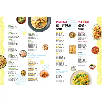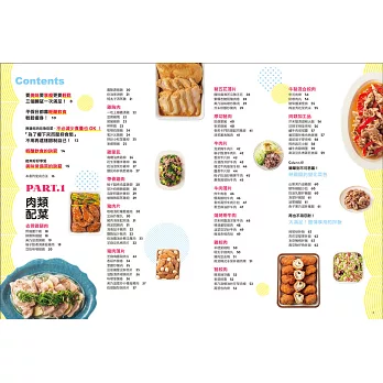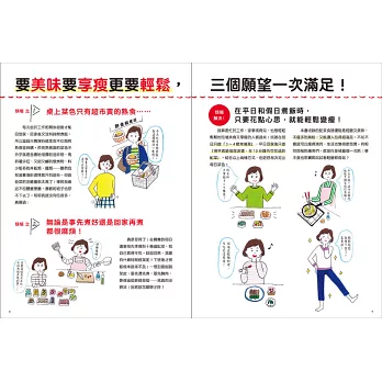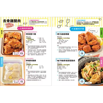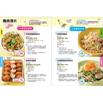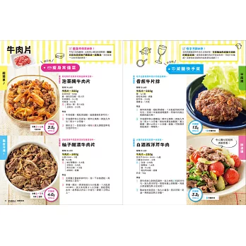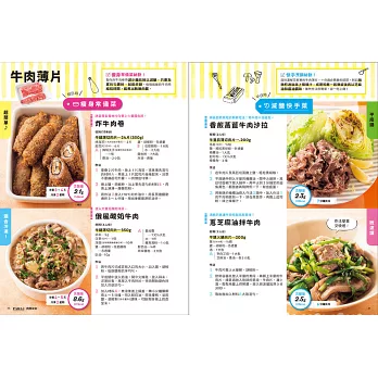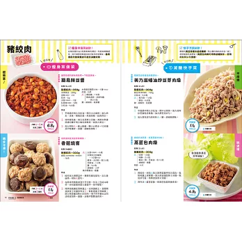 在內頁編排上,左頁是假日時可以多煮一些的瘦身常備菜、右頁是平日下班後能夠快速料理的減醣快手菜,並以顏色區分,一目了然。