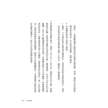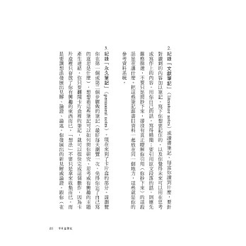 ‧本書內容不綁定特殊軟體,而是將重點放在長遠的「筆記原則、思考、書寫」;