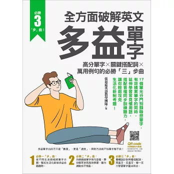 單字不止要看得懂,更要聽得懂!記熟單字≠高分保證,超過5成的考生費盡心思學了大量單字,最後卻都踢到「聽力聽不懂」這塊大鐵板。本書單字例句皆附外師親錄音檔QR code示範道地發音,學習單字的同時還可以熟悉聽力測驗語速,高效率同步準備聽力測驗與閱讀測驗,在考場也能更加遊刃有餘!