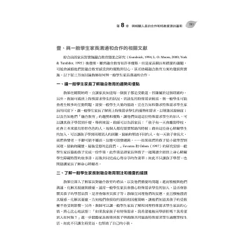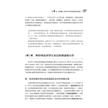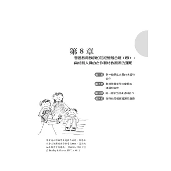 回首撰寫本書的過程,我腦海浮現出浸淫浩瀚文獻,每天帶著電腦,利用零碎時間在鍵盤上筆耕的我。我深刻體會「滴水成涓,積沙成塔」的力量,哪怕是學校和家庭兩頭忙碌,我能寫作的時間是那麼地少,但憑藉著一個信念──改變是一種過程,每一次偉大的改變都是因為我們在過程中點點滴滴做了許多小事情,我終於完成了這本書。本書得以順利出版,要感謝的人實在太多了。首先,我要感謝洪雅慧、余欣庭、魯翠儀小姐鼎力繪製每一章的插圖,讓本書大為增色。還要對20多年來與我一起做融合教育實務研究的教育人員致上最誠摯的謝意,包括國小資源教師,有黃慈愛、蔡志浩、林慧蓉、陳香吟、陳啟文、李桂英、陳鈴冠、洪惠娟、顏瑞隆等九位老師;原先在國小教書,而後至國立臺灣師範大學任教的林月仙老師;以及協助專案研究的助理林淑玲、莊竣博、陳秀冠,我從他們的身上確實獲益良多!此外,在協助經營理念學校「大津融合中小學實驗班」的過程中,一起共事的許多老師、家長、基金會董事,乃至於學生;所有參與我研究的師生群,以及研究所課堂中的學生們,和研習場合的在職教師們,他們提供給我成長的養分,與撰寫本書的動力和啟示。其次,前後期工讀生林蓓芝、余庭嘉、劉淑棋小姐,他們幫忙找資料、打字和做索引等瑣碎工作;博士班學生林敬修協助校對文字;心理出版社林敬堯總編的協助出版、陳文玲執編的細心編輯,我也要在此一併致謝。最後,更要感謝外子、婆婆,在天上的父母和公公,以及一對可愛兒女,即使他們不太理解我為什麼要這麼辛苦,但仍然支持我,他們都是這本書的幕後功臣。