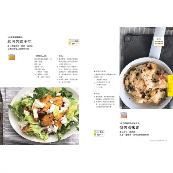 ◎一鍋到底簡單食譜─用一種廚具就能做好的食譜,活用平底鍋、鑄鐵鍋和電磁爐,10分鐘就上桌的快速美味;還可減少料理完後要清洗的鍋具和餐具,節省時間的一個技巧。