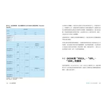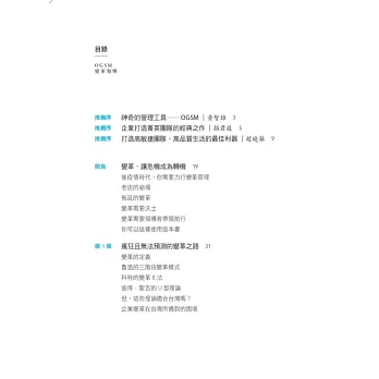 精選31道最常見Q&A,精準對症下藥:各章節除了解說OGSM真義之外,作者更以多年輔導企業執行OGSM的豐富經驗,列出最常見QA,方便各家企業在運行OGSM中途,隨時查看執行細節,快速索引以達到立竿見影的效果。