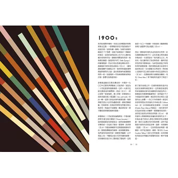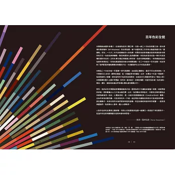 本書精挑細選許多圖片,在頌揚色彩的力量之際,也是一趟二十世紀的視覺之旅。首先登場的是新藝術(Art Nouveau)的自然色調,接下來還有二次世界大戰期間盛行的「愛國風」用色;一九六○年代出現繽紛的七彩色調,而霓虹燈似的色彩更是龐克族用來展現身分認同的方式。色彩能夠將變動、觀念與感受化為具體視覺,有些色彩甚至成為一個年代或某種思潮的代名詞。正如社會在穩定與動盪之間交替,色彩也會輪替變化,有時透過和諧的色調來表達安定,有時則透過衝突的組合來傳達激動。在二十世紀的一百年期間,科技革新了我們創造與複製圖像和物體的手法,也改變我們生活中的色彩感受。