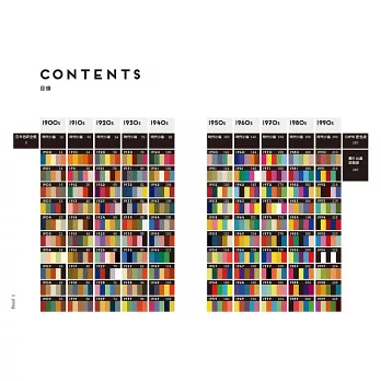 本書為二十世紀的每一年選擇一張代表圖像,並挑選五種顏色,運用不同比例來調色。文中會標示出sRGB(標準紅綠藍)值,供讀者參考與複製。此外,本書以十年為一個期間,每期間都附上導讀,提供當時流行色彩的背景資訊,並描述文化與藝術界發生了哪些大事。本書選擇的圖片主題非常豐富,有時尚、室內設計、音樂和電影,來源也很多樣,包括海報、雜誌、廣告、壁紙與紡織品等各種大量生產的圖像之作。