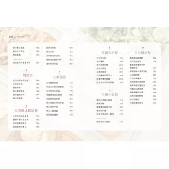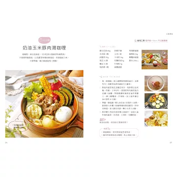 這本書介紹的都是我實際做過,不會太難,也容易上手的料理。從開火就上手的料理、免顧火輕鬆煮、一鍋到底方便煮、省時省力暖心湯、5分鐘簡單甜點,對於剛學習料理的新手或忙碌的上班族,都是很好學習的零失敗料理,省時、輕鬆又美味。