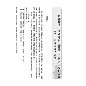 本書包含〔金元明北曲雜劇編〕第拾肆至第拾陸章(北曲雜劇之餘勢:明初憲宗成化以前百二十年作家作品述評),與〔明清南雜劇編〕。而明初百二十年間,雖然劇壇蕭索,但也出了幾位北曲雜劇作家,如谷子敬、羅本、康海、馮惟敏在文學上都有成就,但真正可以稱作大家的,只有一位周憲王朱有燉,他的《誠齋雜劇》三十二種俱存,音律諧美,詞華精警,以故能風行一時,而其大量突破北曲雜劇體製,極力講求結構排場,更使得雜劇得到改進,且開出向前發展的途徑。他在中國戲曲史上的地位,就好像詞中的柳永,居於轉變的關鍵和樞紐。而與北曲雜劇相關之曲論,芝菴《唱論》之說曲唱已如此精到,周德清《中原音韻》已知以官話統一北曲聲韻,鍾嗣成《錄鬼簿》殷勤登錄一代文獻,夏庭芝《青樓集》能著眼於為一代優伶存典型,寧憲王朱權及其門下客不厭其煩為北曲立下譜式;凡此如無超人之眼識,焉能著成此佳製鴻篇。