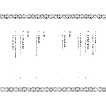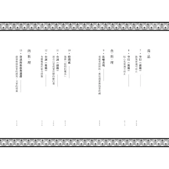 我將本書的架構設計為全餐的形式。話說,二十四道料理未免也太多了?全部吃完的話,肚子應該會撐破吧?專欄則設計成讓味覺休息或轉換一下的「清口」小點。再話說,清口竟然多達四次,簡直跟換好幾套禮服的大明星豪華婚宴一樣嘛!