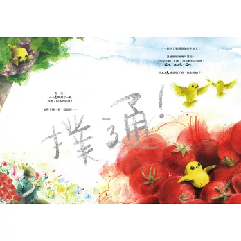 就在某一天,這隻怕高的小小鳥竟然不小心跌落到一台載滿番茄的藍色卡車!