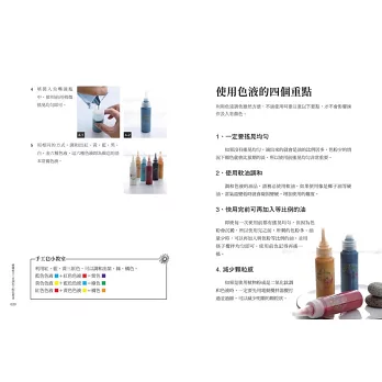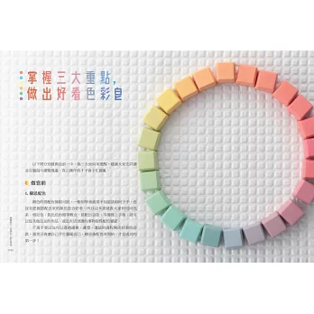 顏色這麼多,該從何下手?不用擔心,娜娜媽歸納出幾個大原則,並佐以大量示範圖片,不用憑空想像,只要照著圖片指示操作即能完成,還能自行延伸創作。