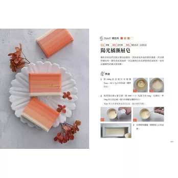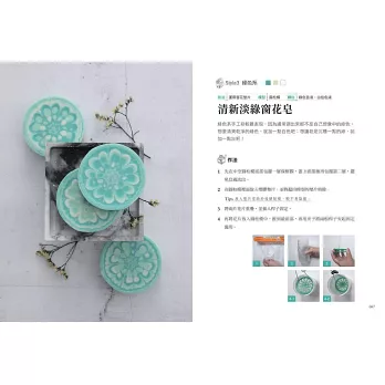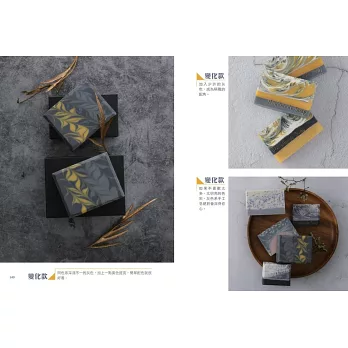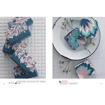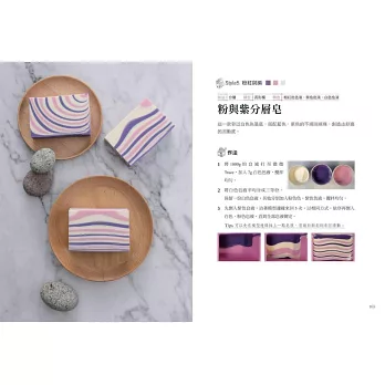 本書並融合了各種技法,像是皂中皂、分層、渲染、窗花墊片等,製作出上百款豐富迷人的手工皂。