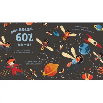 雖然書名說的是我們和香蕉有25%的基因一樣,但我更喜歡書中說到果蠅的那一段。沒想到牠竟然有60%的基因和人類一樣,甚至還是代替人類前往太空的戰士!──靚靚(小學三年級女生)
