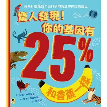 不可置信!你竟然有25%的基因和香蕉一樣?除了愛吃香蕉外,拿起鏡子左看右看,要說一樣也太牽強了吧!再怎麼看,都是我比較可愛……大自然的神奇之處在於動、植物為了適應環境不斷的演化,科學家透過解析物種的DNA,了解其中演化的相關性,有了基因圖譜,我們得以窺探自然的奧祕。相似度25%、75%、90%……這本書想要告訴小朋友的不只是科普,即使相似度達99.9%,你都是這個世界上獨一無二的!你值得珍愛你自己。──盧俊良(「阿魯米玩科學」版主、宜蘭縣岳明國小自然科教師)