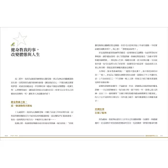 本書更有飲食與運動傷害處理,這是身為健身教練的我最想傳遞的訊息,也就是學習正確運動觀念與姿勢,讓自己在安全、避免受傷的狀況下健身,這是健身教練很重要的職責。