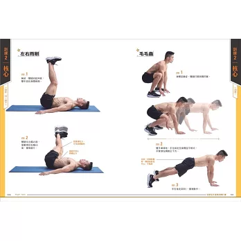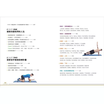 本書均以「徒手訓練」為主,搭配啞鈴和彈力繩,隨時隨地都能健身,包括暖身、訓練與伸展:從利用滾筒幫助身體各部位暖身、活動度訓練,接著進入核心、上肢、下肢以及心肺等各處肌群訓練,再到最後的肌肉充分伸展;各位讀者可以先以全身訓練為主,再逐步加強希望強化的部位。