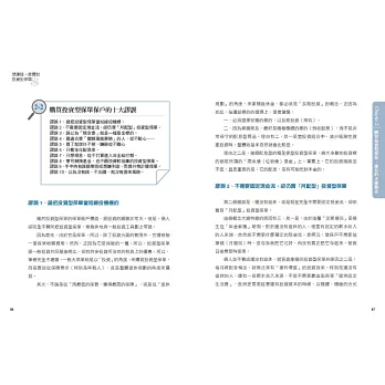 書中提到與投資型保單相關的六大風險、八大提醒、產生虧損的三種特色,以及十大謬誤等,都是十分寶貴的重點防身術。不論是已經手上抱滿投資型保單的讀者,或是正面對努力向自己推銷投資型保單的理專,仔細閱讀本書絕對是開卷有益,是稍解困境的方法之一。——劉凱平|安睿宏觀證券投資顧問公司總經理