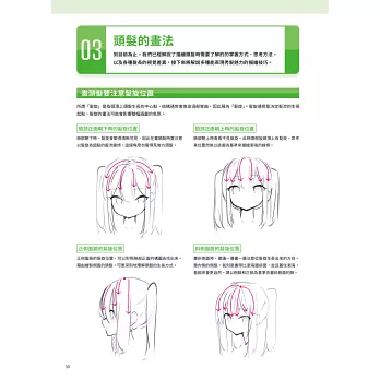 ■ 解說各部位頭髮的描繪方式,包括髮根、髮尾、瀏海、側髮、後方頭髮等