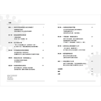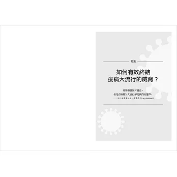 本書每章說明一個必要的防疫步驟,這些步驟加起來,就是終結大流行病威脅的整體計畫,這個計畫不只可避免壞事發生,更將加速衛生醫療、數位科技、元宇宙經濟走向長期成長。