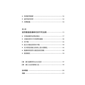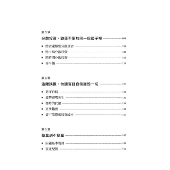 本書以六章闡述投資的大原則,包括著眼長期、無視市場波動,以及如何利用退休金計畫增加儲蓄和盡可能節稅;也就分散投資、再平衡、定期定額法與指數化等議題加以說明。讀者只需付出一些閱讀時間,就能獲得最精闢的投資贏家心法。