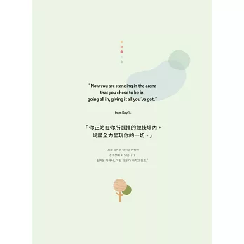 DAY 22 Give yourself what you deserve.給自己應得的享受 DAY23 Change the way you talk.改變說話方式 DAY 24 Choose your stories.選擇你的故事 DAY 25 Being positive is powerful.正面思考會帶來力量 DAY 26 Don’t let it ruin your joy.別破壞你的快樂 DAY 27 Nourish yourself.滋養自己 DAY 28 Take full ownership.請掌握主導權 DAY 29 Set up for success.為成功做好準備 DAY 30 Have fun in the way.享受過程 DAY 31 Don’t make it a problem.別當回事