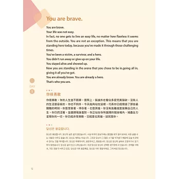 DAY 1 You are brave.你很勇敢 DAY 2 Let’s reframe fear.重新定義恐懼 DAY3 Do what scares you.做令你害怕的事 DAY 4 You are a precious human.你很珍貴 DAY 5 Don’t blame the good guys.別責怪你的優點 DAY 6 Say this as today’s affirmations.今天請這樣宣誓 DAY 7 Find your passion.找尋你的熱情 DAY 8 Be committed.請堅持到底 DAY 9 Expect to make mistakes.預想可能的錯誤 DAY10 Get inspired.吸取靈感 DAY 11 How to not get criticized.如何不受批評 DAY 12 You are worthy.你很有價值
