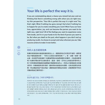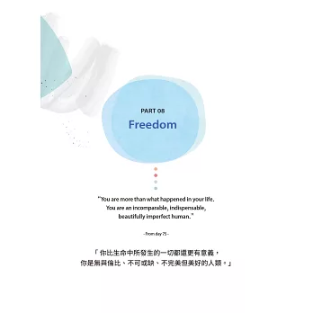 DAY 70 Your life is perfect the way it is.你的人生已經很完美 DAY 71 Do a reality check.與現實接軌DAY 72 Re-decide everything in your life.為人生重新做選擇 DAY 73 It’s okay to be a hot mess.失誤也無傷大雅 DAY 74 You have your own timing.你有自己的時機 DAY 75 You are more than what happened in your life.你比過去更有意義 DAY 76 Be unshackled.解放自己 DAY 77 Let go of “good intentions.”放下單方面的善意 DAY 78 You deserve to be healed.你有被治癒的資格 DAY 79 Everything about you is perfect.你的一切都很完美 DAY 80 Every relationship is perfect.每一段關係都很完美