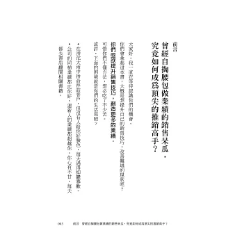 在書中,作者完整分享他獨創的這套業務心法,帶你走過提升成交率的五大階段,並以大量對話範例告訴你如何掌握客戶心理、發掘需求,製作出屬於你的有效銷售劇本,改變你的業務人生。