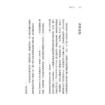 ※如果世界上因為死亡而少了「我」,意識究竟能魂歸何處?如果科技能無限期支持長生不死,你會想要嘗試一下嗎?獲得不死的禮物後,女主角康兒的人生彷彿經歷了長達一年半的「國防布」。為了探尋真相,身為複製人的她轉守為攻、出關探險。當謀殺成為事實,破案就是義務!於是她只能「Over her dead body」,自己的命案自己辦。然而,愈來愈多的黑箱卻陰險地等著她飛蛾撲火……這真是本令人廢寢忘食的精采科幻小說!──黃貞祥,清大生命科學系助理教授 ※這書好看炸了!作者交出超棒的推理故事,採用真實科學設定,卻揉製成一個新穎又震撼的設定。──布萊克.克勞奇,全球暢銷小說《人生複本》作者 ※本書閃耀登場,帶我們在調查謀殺與逃命自保之間,加入複製人與科技倫理如電光激烈作響的思辨之中,支持與懷疑、信任與陰謀,科技的統治必須深思。──紐約時報