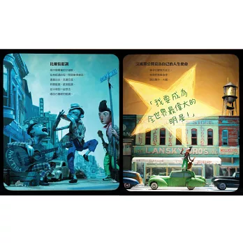 本書畫面更不同於一般的繪本,全部採用高難度、好萊塢電影等級的「偶動畫」設計!書中所有人物、道具、場景皆為手工立體製作再拍攝為定格畫面,人物情緒、光影表現與場景立體感更為細緻深刻,不論是獲得唱片公司邀約的喜悅、或推出首張單曲時的忐忑不安,以及失去初戀的心碎,偶動畫都可呈現出彷若身歷電影的情境與深度,讓人忍不住再三回味,並更能對書中情節產生共鳴。書衣內還附貼心彩蛋,分析偶動畫中人偶角色的製作材料,引導孩子發揮想像力與造力,在讀完貓王的傳奇人生後,也能發揮創意,揮灑出屬於自己的天空與故事。