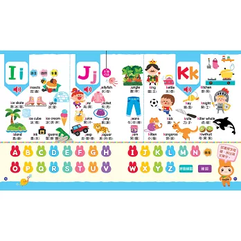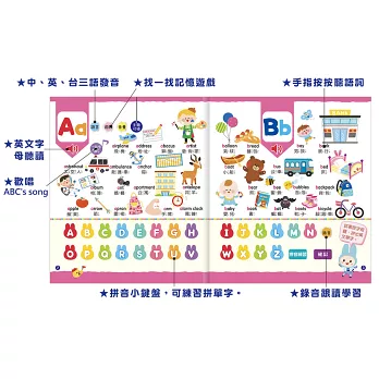 只要用手指按一按,就能逐漸學會26個英文字母及360個相關單字,再搭配可愛圖像記憶,讓孩子即使自己學習及遊戲也沒問題,輕鬆無負擔。