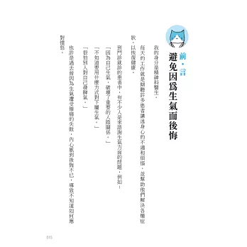 緩和怒氣有方法,書中提供超過20種平息憤怒情緒的訣竅、超過10種好好生氣的技巧,帶著你一步步學習如何處理憤怒的情緒,從此以後再也不會因為對人發脾氣而感到後悔。