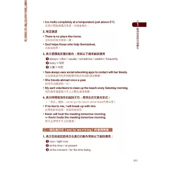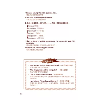 全書句型重點皆以大量例句示範講解,讓讀者直接從例句觀察文法使用模式,不怕看不懂句型說明,學習更直觀,效果更顯著。例句撰寫用詞簡單實用,貼近日常生活,讓讀者可以在生活中運用所學知識。