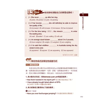 每個句型重點後面皆附「即時測驗」,幫助讀者學完一個部分就可以馬上檢視學習成效。每單元最後還有「綜合練習」,鞏固記憶的同時找出學習盲點。