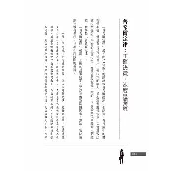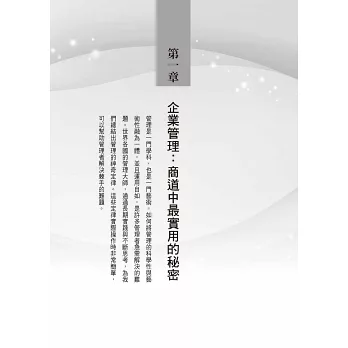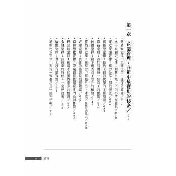 「奧卡姆剃刀定律」告訴我們:在處理事情時,一定要把握事情的宗旨、目標,解決根本問題,順其自然,不要把事情複雜化,這樣即可順利地把事情處理好。在企業管理中有「商道最實用的秘密」;在職場時「有些規則你必須明白」;在情緒中「讓自己時刻保持最佳狀態」;另外,還有各種生活的智慧,讓你認識,你為什麼會不快樂?以及你對成功的想法是什麼?