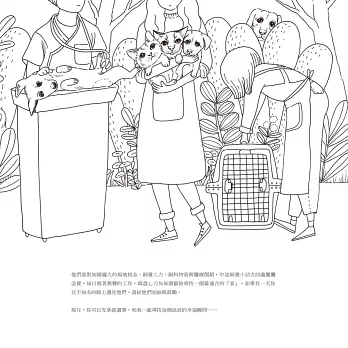 而後又知道了許多關於「愛媽、愛爸」的故事,他們散盡千金、上山下海,哪裡有流浪動物就往哪裡衝。看著一件又一件的救援事件,想著要如何讓這些狗狗、貓貓的故事轉化為美好的畫面發散呢?也許著色書會是一個很好的載體。