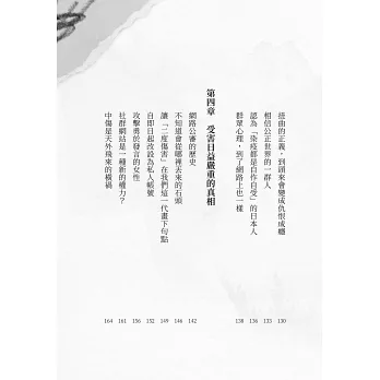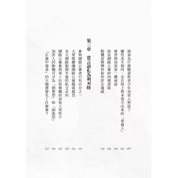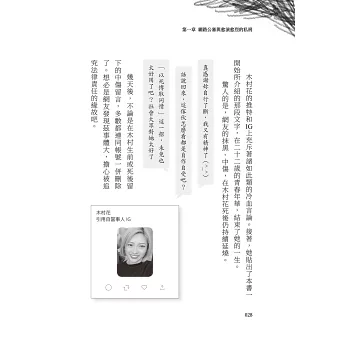 2.本書不只是聚焦於發布惡意謾罵或威脅訊息的加害者,團隊更採訪諮商心理師、接觸過個案的律師等專業人士,深入剖析被害者無助的心理、一般人如何在無意之間造成特定人士傷害等諸多面向。