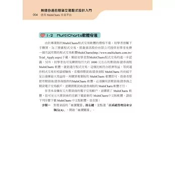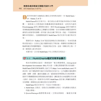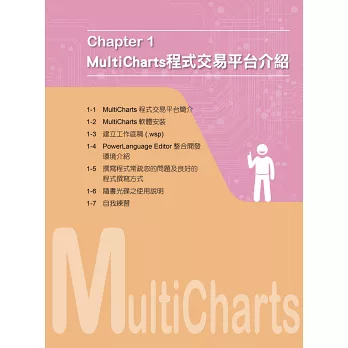 本書籍的主要內容,是介紹如何在 MultiCharts 程式交易平台上開發個人專屬的交易策略,並應用在期貨自動化交易上,讓想從事程式交易的投資者,在短期間學會交易程式的撰寫,以實現不用盯盤的自動化投資目標。