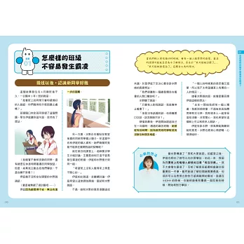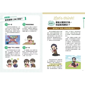 探討「如何應對你不贊同的朋友行為」、「反省那些無法傳達的心意」、「成為一個善於傾聽的人」、「該如何不被氣氛牽著走」,從被害者、加害者,以及旁觀者的角度來思考各種問題。