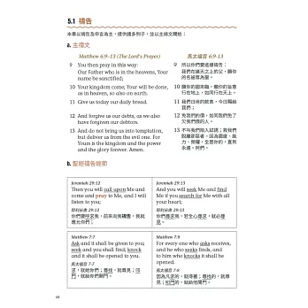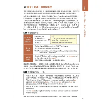 本書簡介語言結構,從詞首、詞根、詞彙、例句、句型到文本段落;初期計有1,075 個詞彙,應編輯要求,從中挑選250 個詞彙。此外,還融入新文化的生活語言、留學英美經歷,附錄有助於理解聖經。