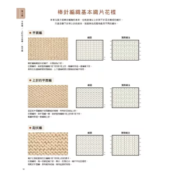 第2章 棒針編織基本知識:編織的基本單位是1針,再來是1段,最後構成一整面的織片,無論是織片各部位專有名稱、基本織片花樣、密度測量、織圖看法等,所有初學者想知道的基本知識都有詳細說明。