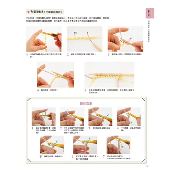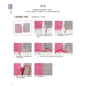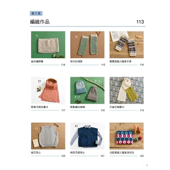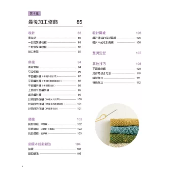 第4章 織品加工修飾:完成作品的所需織片後,凡是最後固定針目的收針、收縫;織片的併縫&綴縫、藏線、整燙技巧,以及毛球、流蘇等能夠提升織品完成度的技巧都匯集在此,這些細節往往是決定作品精美程度的重點,不可小看喔!