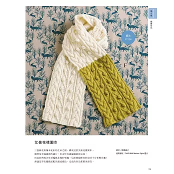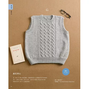 第5章 編織作品:運用前面章節的技巧,實際動手編織看看吧!從簡單的起伏編脖圍、鬆緊編毛線帽,稍有變化的樹葉花樣長圍巾、桂花針襪套、費爾島織入圖案手套、北歐風織入圖案波奇包,到新手也可挑戰的艾倫花樣圍巾、麻花背心、根西花樣背心,藉由實作成為棒針編織達人吧!