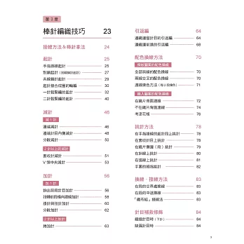 第3章 棒針編織技巧:各式起針手法、加針、減針、挑針、換線、編織斜線與弧線的引返編等,棒針編織最基礎的必備技巧,全都搭配簡單明瞭的示意圖,加上照片圖解一一解說。