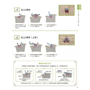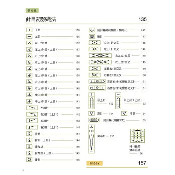 第6章 針目記號織法:收錄38個常用針目的記號圖示與針法圖解步驟,方便初學者在還不熟悉織法時立刻查詢,按圖操作。