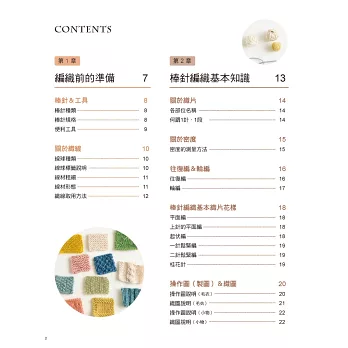 第1章 編織前的準備:工欲善其事,必先利其器。本書從最基礎的棒針規格、編織用小道具、織線種類等開始,一一介紹其用途與使用場合。