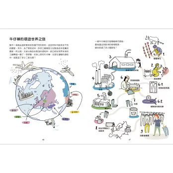 許多工廠會設立在製造成本低廉的國家,所以大部分商品在製造過程中,就已經在世界各地的工廠轉過一圈了。比如你身上穿的牛仔褲,從採收棉花到出口販售,光是運輸上就製造了大量的二氧化碳。我們餐桌上的食物,經過加工、運送和冷藏,產生的二氧化碳也相當驚人。