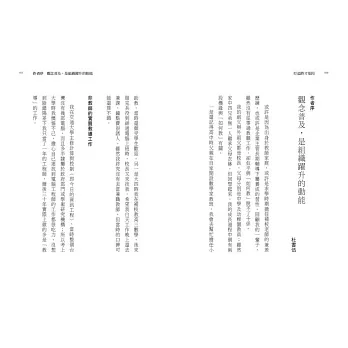 ● 第三部:如何看待組織與制度。制度是幫助工作者快速專業化的know-how,還是束縛?如何降低「不適應症候群」?只要釐清幾項原則,一切豁然開朗。