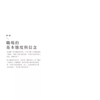 ● 第一部:職場的基本態度與信念。方向對了,自然能事半功倍,分辨年輕人的資產與負債,釐清剛進社會碰到的各種觀念挑戰。