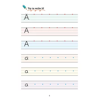 運用英文書寫專用四線格、筆順示範、起筆位置,輕鬆習寫英文字母。