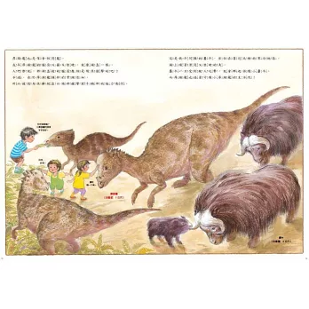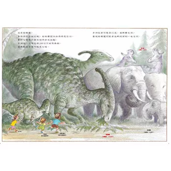 鈴木守還用現今仍存活、人們相對較為熟悉的動物,來與恐龍相類比。例如:非洲象過著群體生活,副櫛龍也是;穿山甲、象龜、犰狳身上有堅硬的背甲或皮膚包覆,甲龍身上像石頭一樣堅硬的塊狀突起物,也具有相同的功能;脖子很長的腕龍,和脖子很長的長頸鹿都吃高處的食物……這樣的呈現,既扣合了「恐龍也是動物」的主旨,也讓恐龍的特性更為清楚明瞭。這是一本科學圖畫書,卻由於作者的這些安排,大大減低生硬度,並讓人感受到恐龍溫柔的一面。