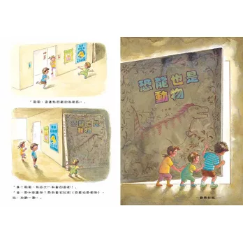 主角們走入的書籍名為《恐龍也是動物》,或許可解析為正是鈴木守想表達的角度:恐龍與所有動物一樣:因為需要喝水,所以會群聚於水邊;看來凶惡的恐龍,身上那些如同武器的「配備」,往往都是為了保護自己、保護小恐龍,而非用於攻擊;因著體型的不同,牠們覓食與產卵的地方隨之有異;為了繁衍、生存,恐龍不斷適應環境而產生演化。整本書便是如此將恐龍極為生活化的面向呈現出來。